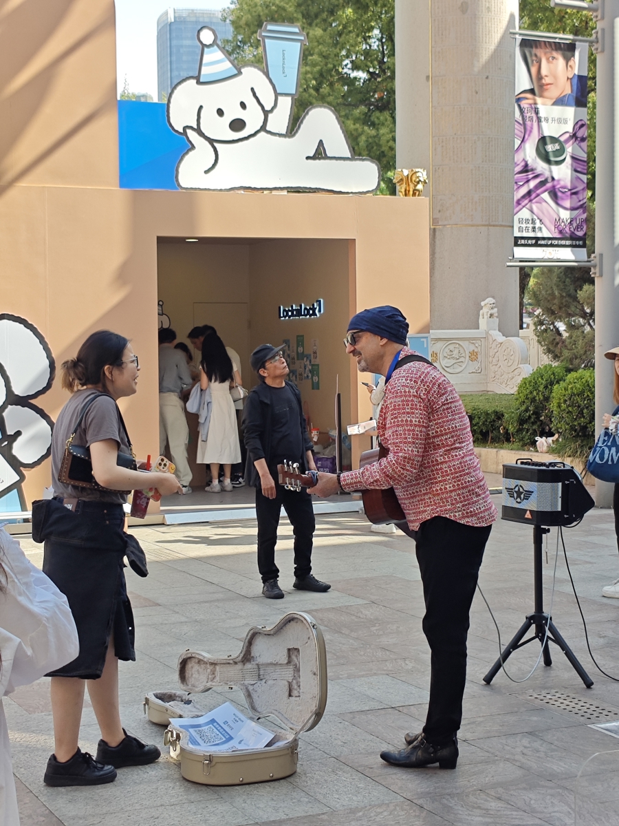 人称“柯教授”的柯伟历,平常在华东政法教法律。他来自芝加哥,因为娶了一位上海太太,就移居上海,已有将近20年。他不仅熟知张艺谋的电影,还跟着老丈人练气功。他有一位爱尔兰裔的澳大利亚籍律师朋友,名为“大卫”(Dahvida Falanitule)比他早一年成为上海持证街头艺人。于是,擅长吉他弹唱的柯伟历也报名参加,通过考试,就开始在静安寺附近“驻唱”。他在街头演唱的第一首歌是琼·贝兹的《一切不过是命运》,是首反战歌曲——但是,这首歌在上海街头的普及率不高,纯粹只是他个人喜欢。于是,他也懂得了在街头表演过程中互动的重要性,改唱霉霉的歌,气氛就热烈了起来。他特别喜欢周杰伦:“但是,他的歌太难唱得好。但我会唱《简单爱》。”他中文一般般,但是也学会了:“你问我爱你有多深……”自然,中文歌一起,共鸣和惊喜兼具。曾经为芝加哥政府工作了10年的柯律师,以前经常出庭。“出庭与唱歌,其本质都是扮演好自己的角色。”他说的“扮演”已经是广义的生活中的“人设”。“上海是世界上最好的城市,我生命中最重要的三块内容:教学、音乐和冰球,在这里都能实现。”他早已把上海视为故乡,芝加哥已经排名第二。“我住过静安区,我的大女儿就出生在万航渡路新闸路;我现在住在长宁区,中山公园后门。我喜欢静安寺、田子坊、豫园……”