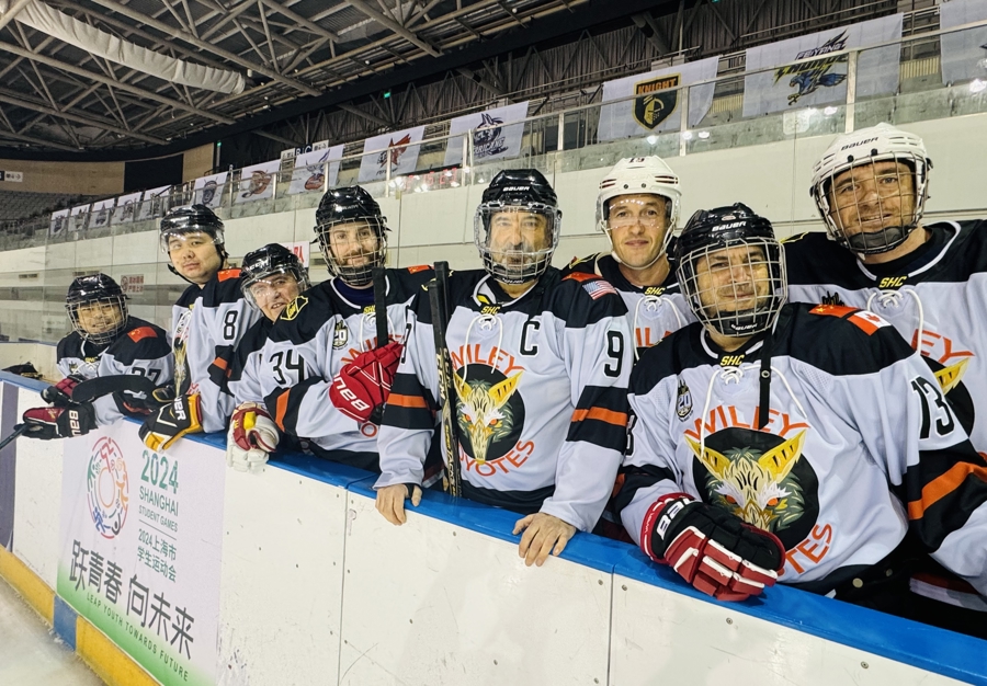 柯伟历(右四)与他的冰球球友(受访者提供)