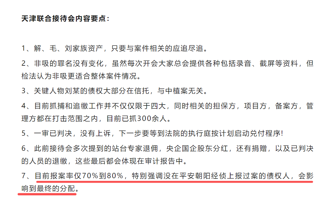2026年1月15日,天津经侦接待会、西安专班接待会如期举行,接待会上接待者称,目前部分地方报案率仅为70%至80%,不报案会影响到最终的分配。